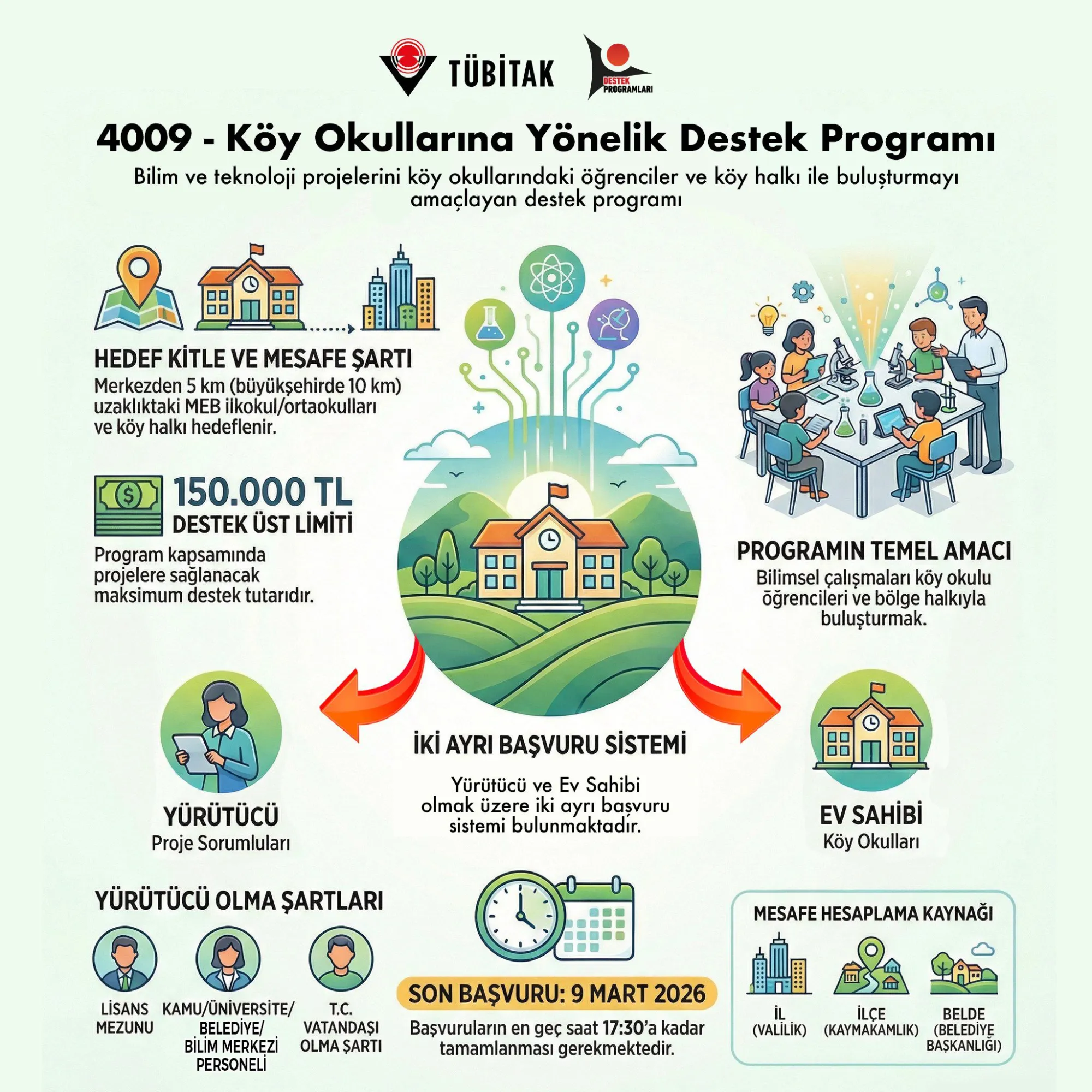 4009-Köy Okullarına Yönelik Destek Programı,  bilim, teknoloji ve eğitime yönelik projeli çalışmaları köy okullarında öğrenim gören öğrenciler ve tüm köy halkı ile buluşturarak il ve ilçe merkezlerinde olduğu gibi daha küçük yerleşim birimlerinde de bilim ve teknoloji farkındalığı oluşturmayı, bilim okuryazarlığını artırmayı ve etkileşimli uygulamalarla bilimsel olguları anlaşılır bir şekilde kazandırmayı amaçlamaktadır.