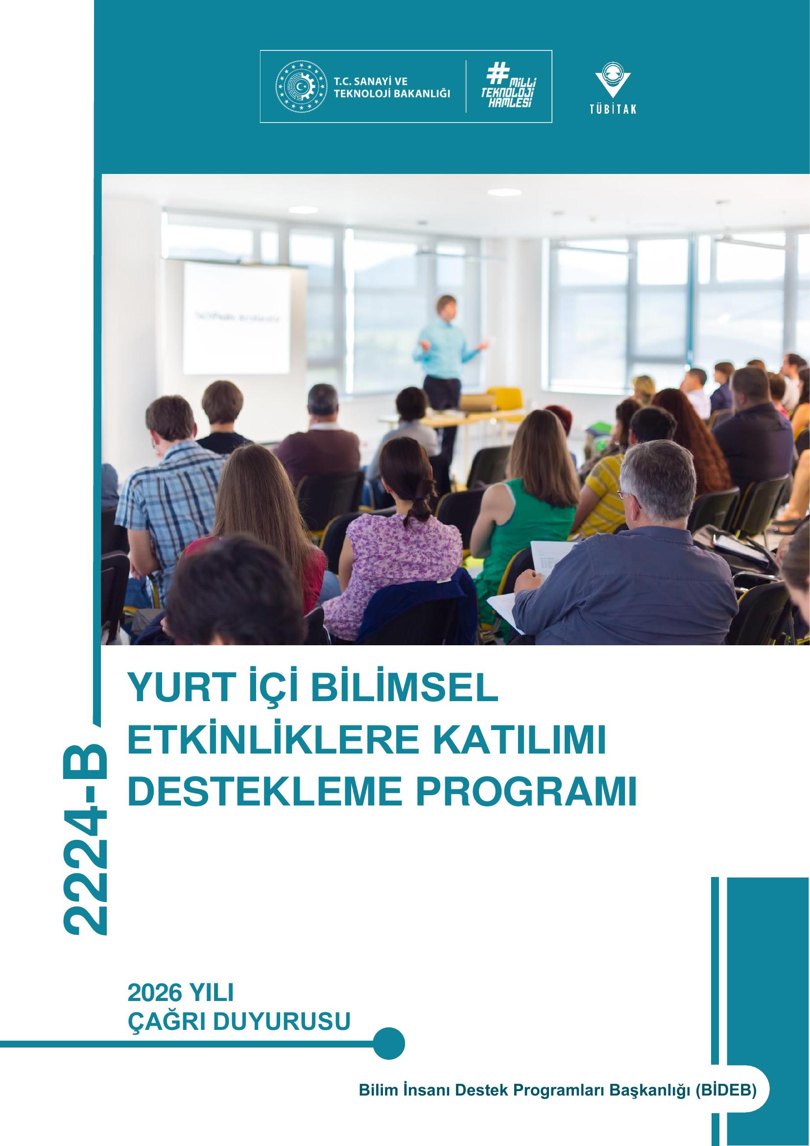 2224-B Yurt İçi Bilimsel Etkinliklere Katılımı Destekleme Programı 2026 yılı 1. dönem çağrısı başvuruya açılmıştır. Başvurular, 24 Şubat 2026 saat 17:30’a kadar BİDEB Başvuru ve İzleme Sistemi (https://ebideb.tubitak.gov.tr/) üzerinden alınacaktır.