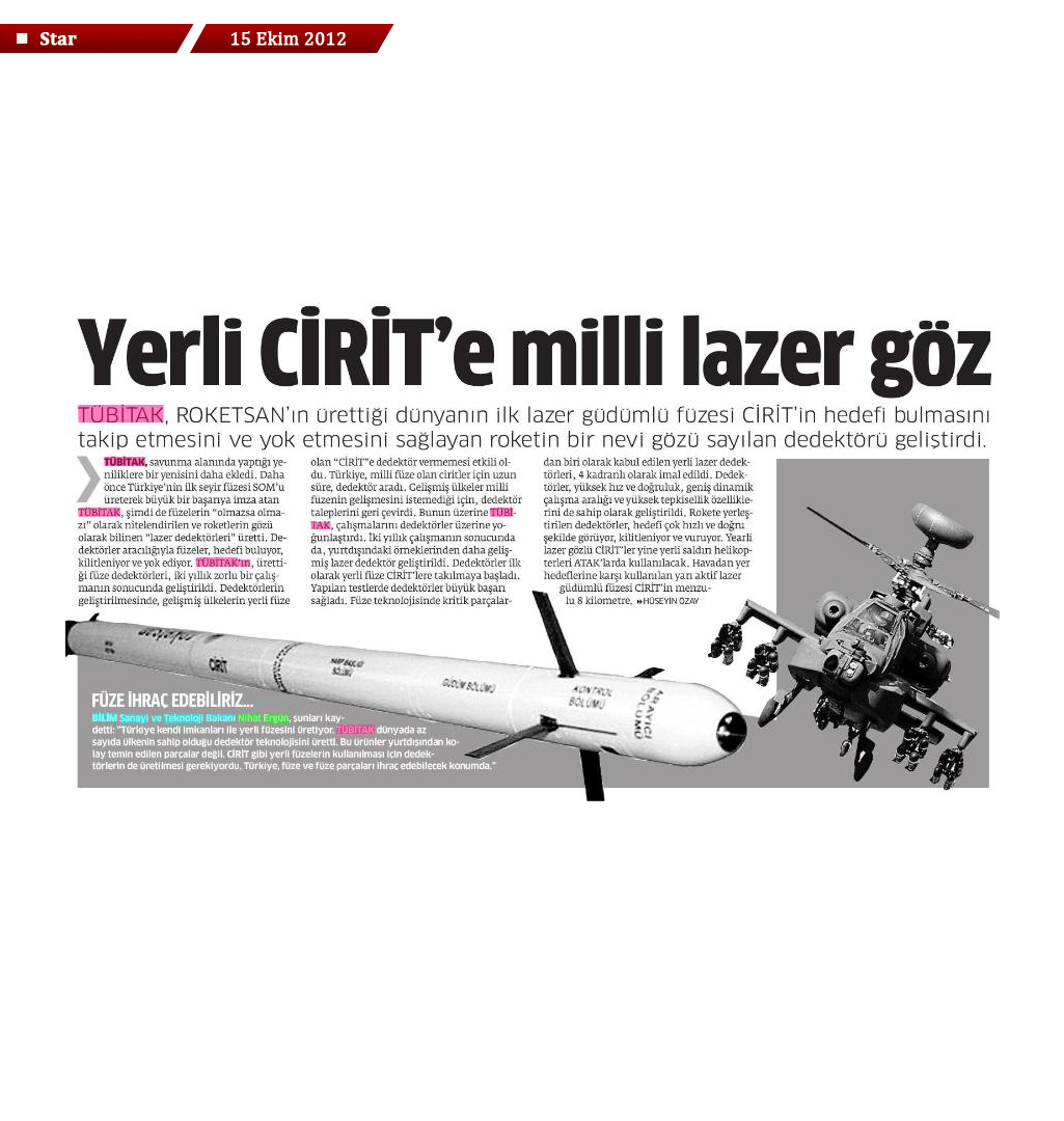 Türkiye’nin ilk yerli seyir füzesi SOM’u geliştiren TÜBİTAK, füze teknolojisinde bir ilke daha imza attı. TÜBİTAK, lazer güdümlü füzelerin gözü olarak bilinen dedektörleri, tamamen ‘milli’ kaynaklar kullanarak geliştirdi. Lazer dedektörler, ilk olarak yerli füze ‘CİRİT’lerde kullanılmaya başlandı.