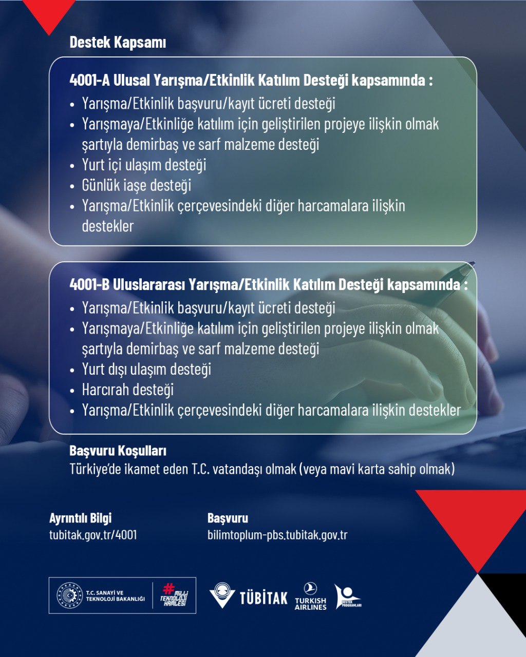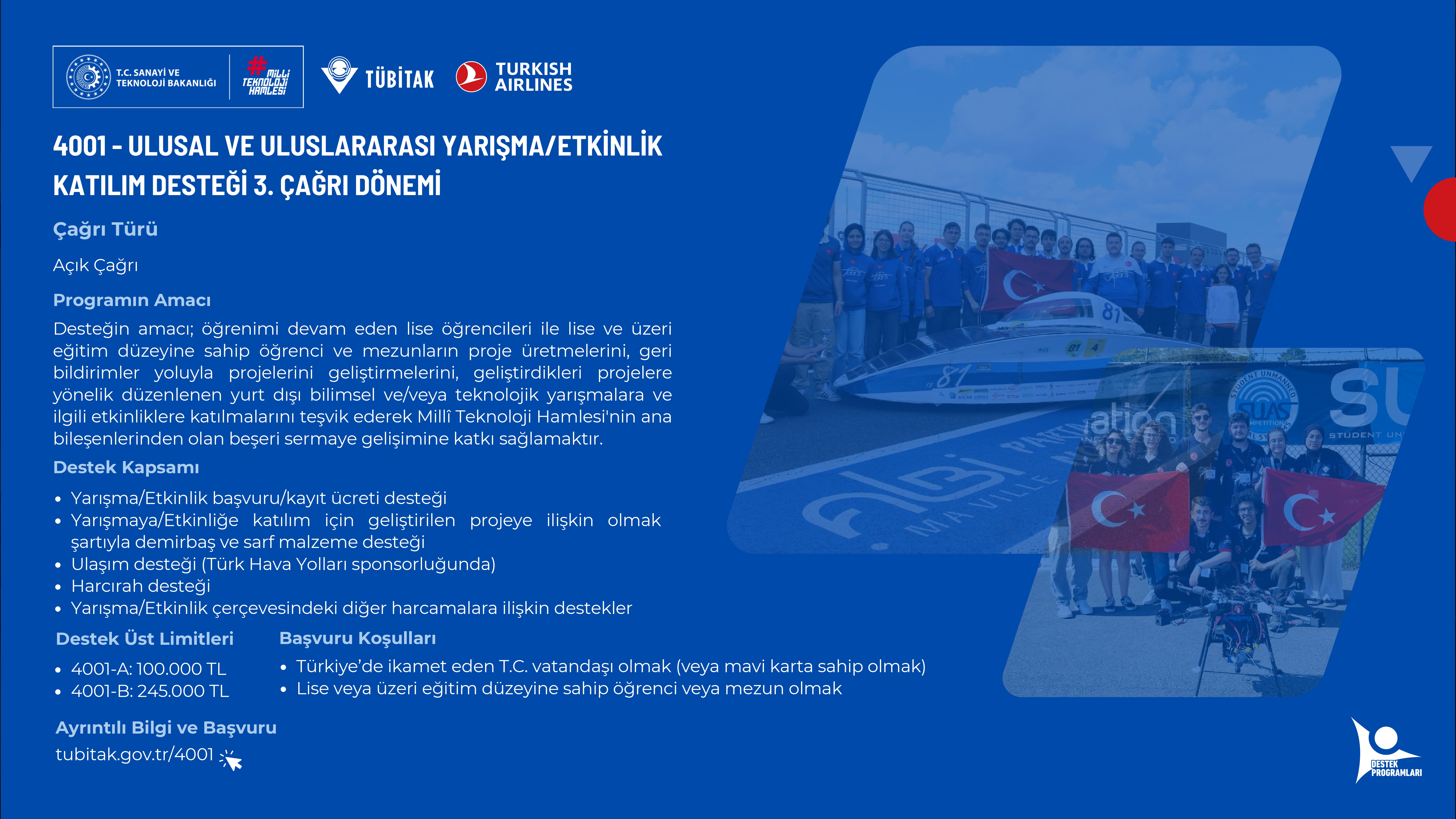 4001 Ulusal ve Uluslararası Yarışma/Etkinlik Katılım Desteği’ne ilişkin sorularınız için: bt4001@tubitak.gov.tr